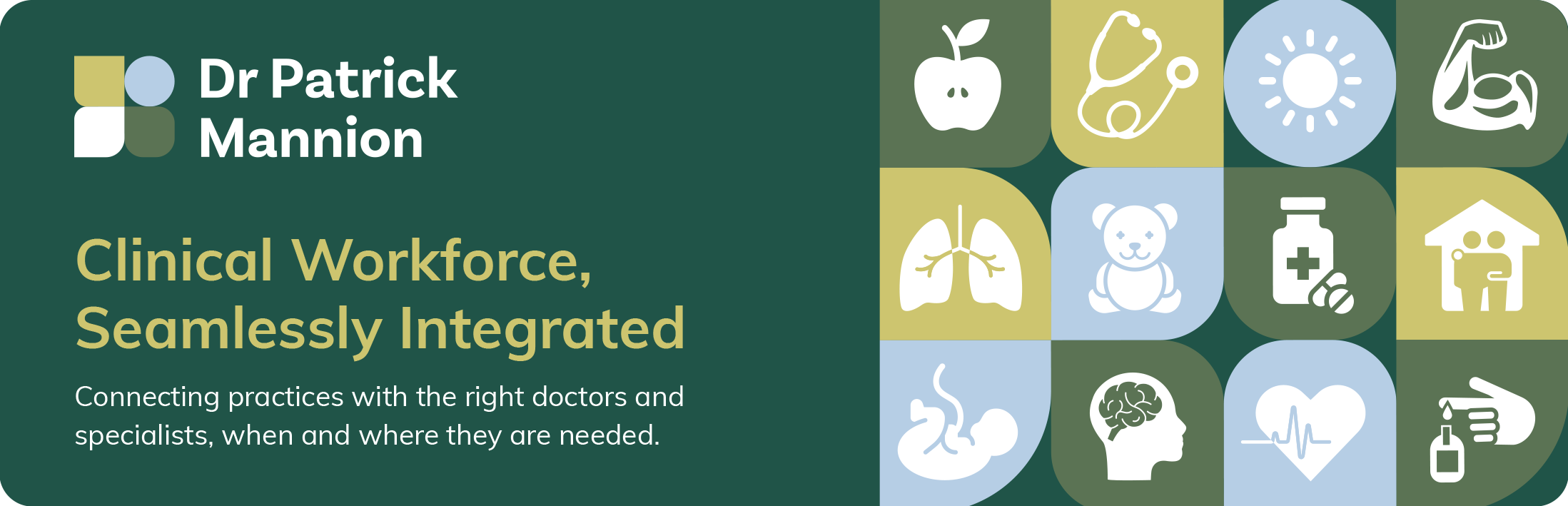 A palette of green and light blue conveys trust, care, and professionalism. Specialist icons highlight key clinical areas and can work alone or as part of the broader visual framework, keeping communication clear and consistent.